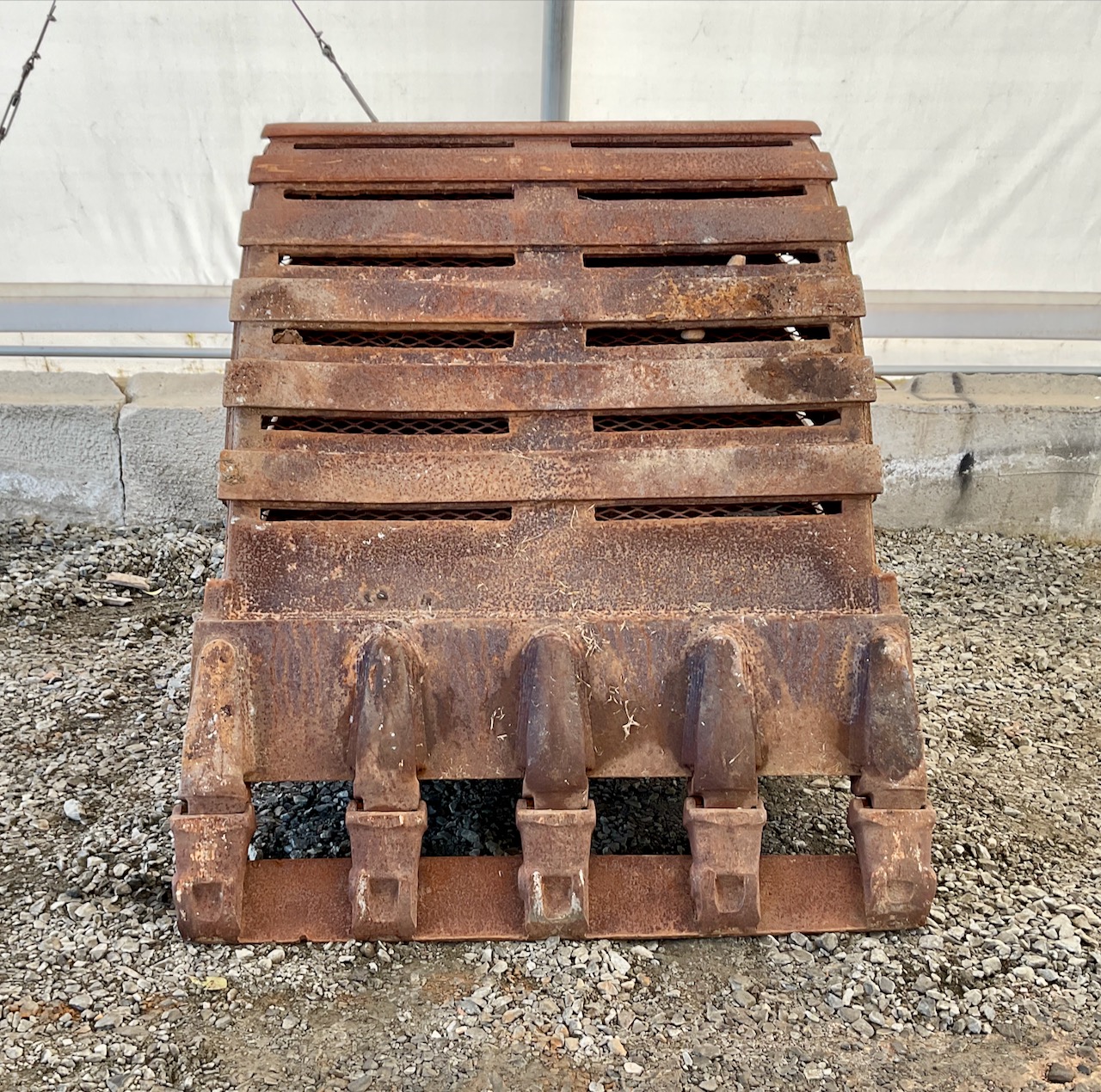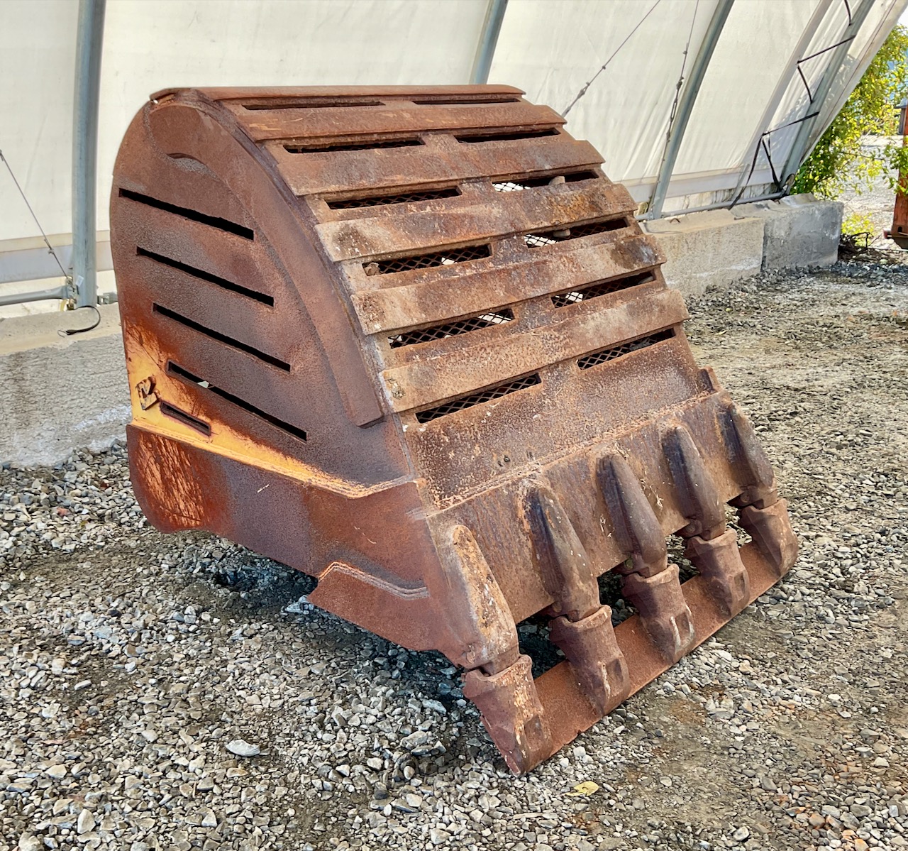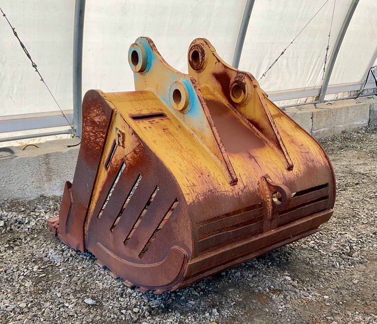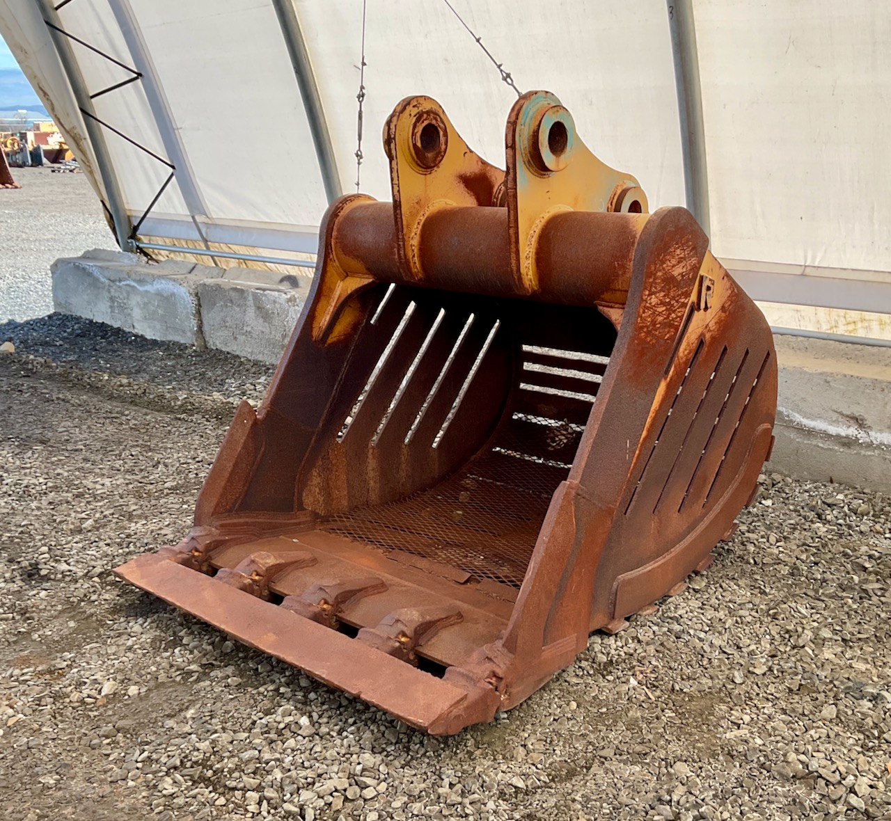 2.44 yard capacity, cutting edge welded to the teeth, lifting eye, slots cut in sides, bottom, and back